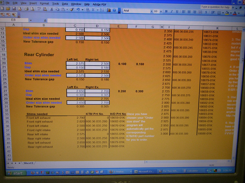 11/20/07: I've had several emails regarding where to buy shims. The easiest is likely your local dealer, especially if you only need a shim or two. However if you need multiple shims or want to build up a mini shim bank, head down to your local Harley Davidson Dealer. The Harley Davidson V-rod and Buell 1125R both use 10mm shims, and since both are considered performance engines, the shims they use are of equal quality to those in your KTM. The shims they sell are available in half sizes which aren't even available from KTM (i.e. 2.425mm) The best part is the price, only $2.40 a shim, less than half of what KTM charges, meaning you can make a 20 shim mini kit for only $48. Here are the part numbers for the most common shims you will need...