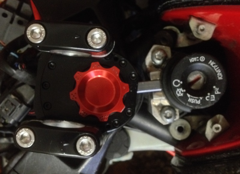 Hello everybody. Continuation. This device was purchased. Since our motorcycle does not have factory adapters, I decided to do it myself. See what happened as a result. The steering wheel was raised a couple of centimeters to place a damper under it and between the traverses. The locking plate easily became on the ignition lock. It was necessary to file a little protruding details. Decorative